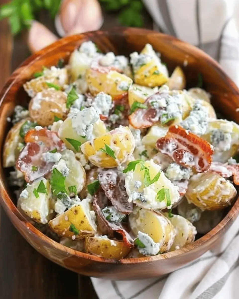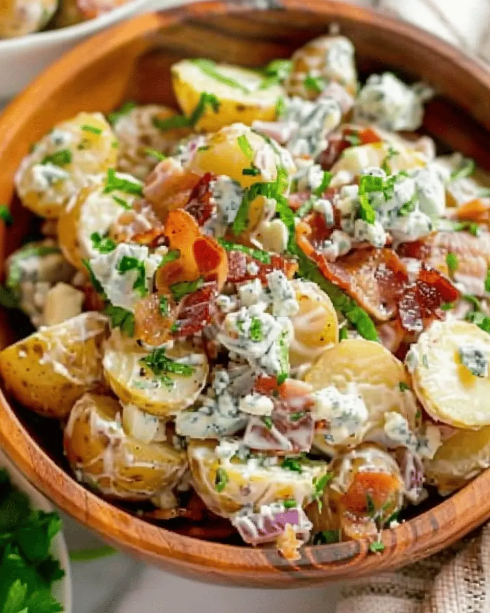 A delicious twist on a classic potato salad featuring turkey bacon and blue cheese.
