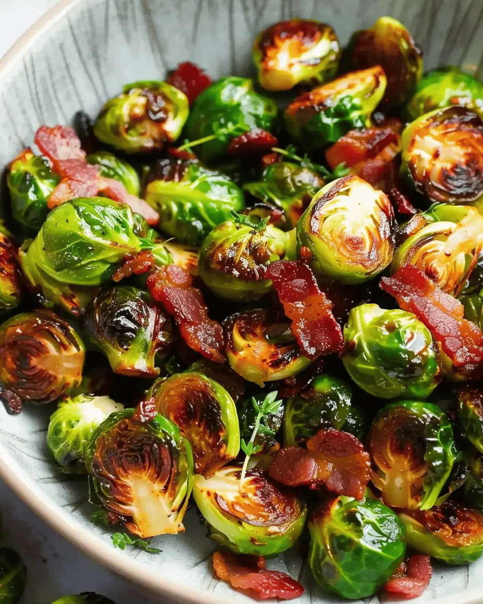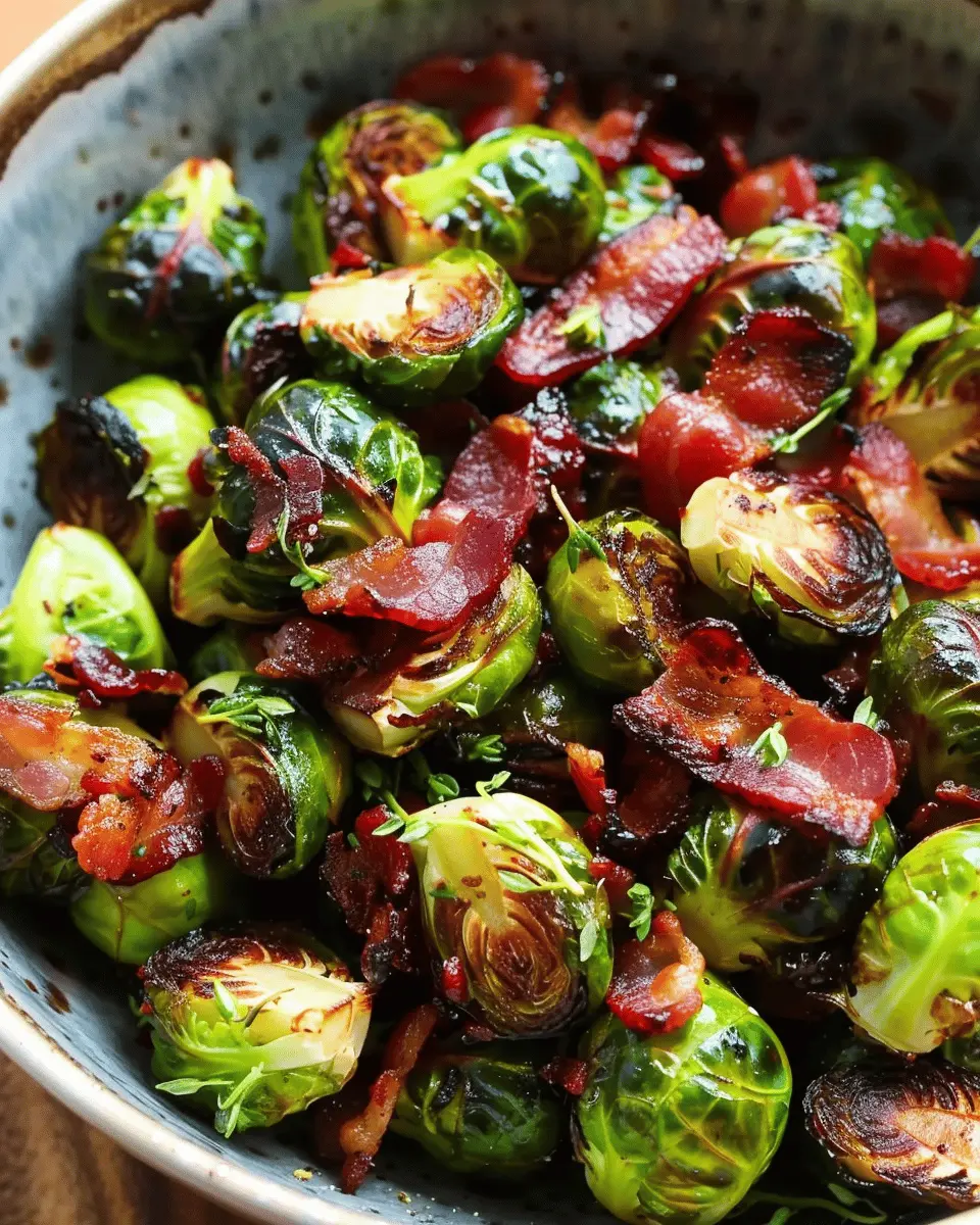 Delicious Brussels sprouts sautéed with crispy bacon for a savory side dish.