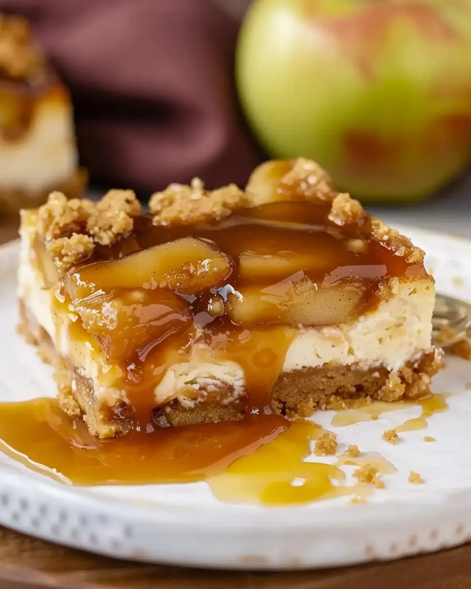 A delicious dessert that combines the flavors of caramel and apple in a creamy cheesecake bar.