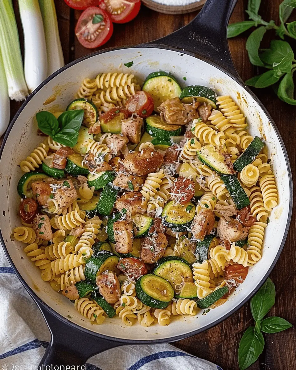 Enjoy a comforting and quick meal with this Chicken Zucchini Pasta Skillet, perfect for busy nights.
