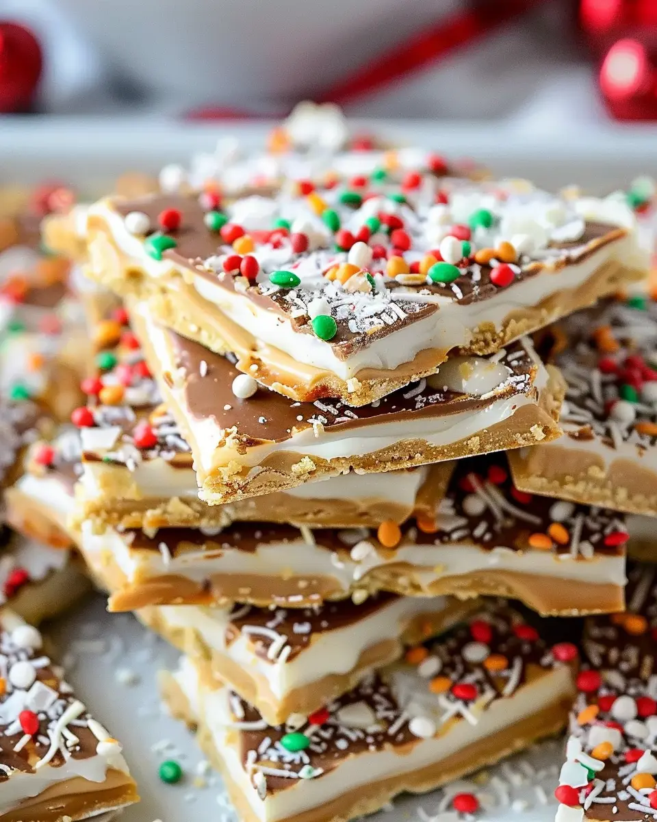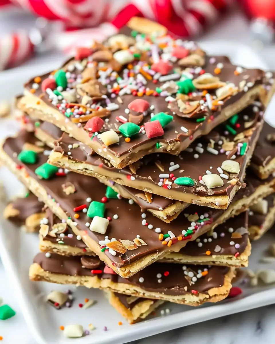 Holiday Platters: Arrange Christmas Crack pieces on a large festive platter, mingling them with other holiday sweets like cookies or fudge. It provides contrast and showcases your culinary efforts beautifully.