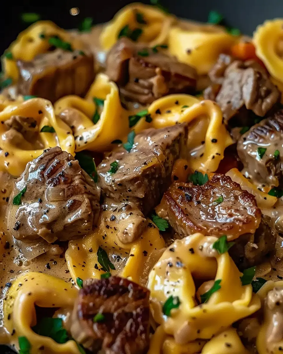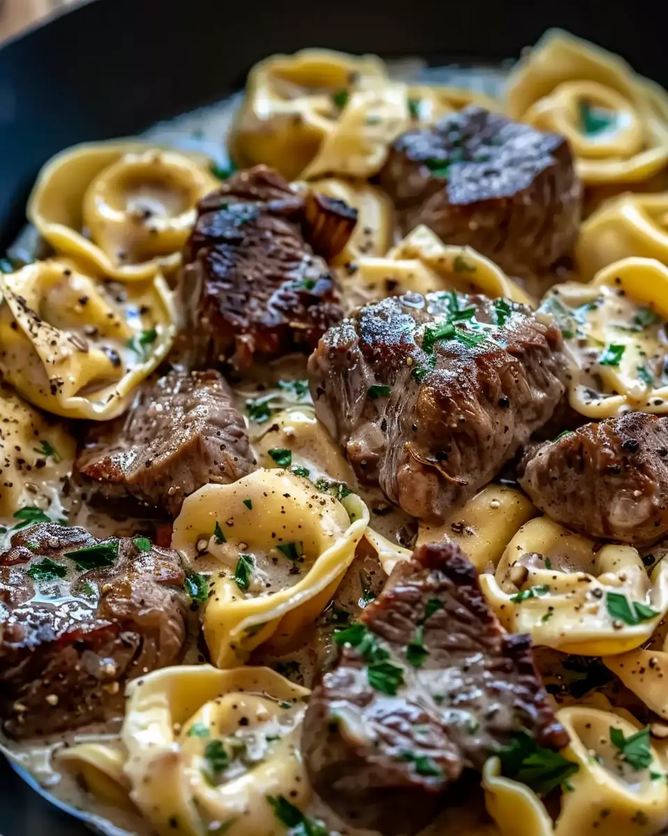 A rich and flavorful dish combining steak, tortellini, and garlic for a satisfying meal.