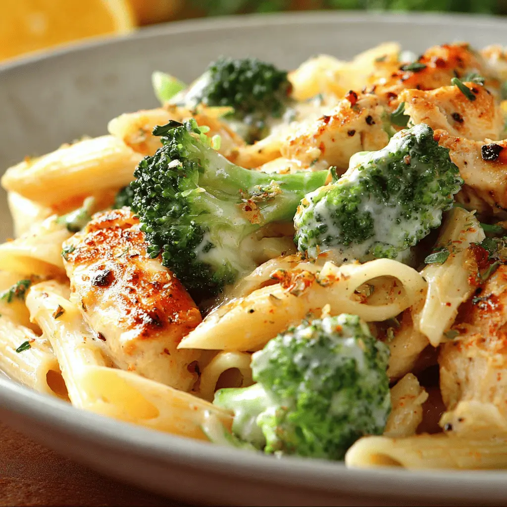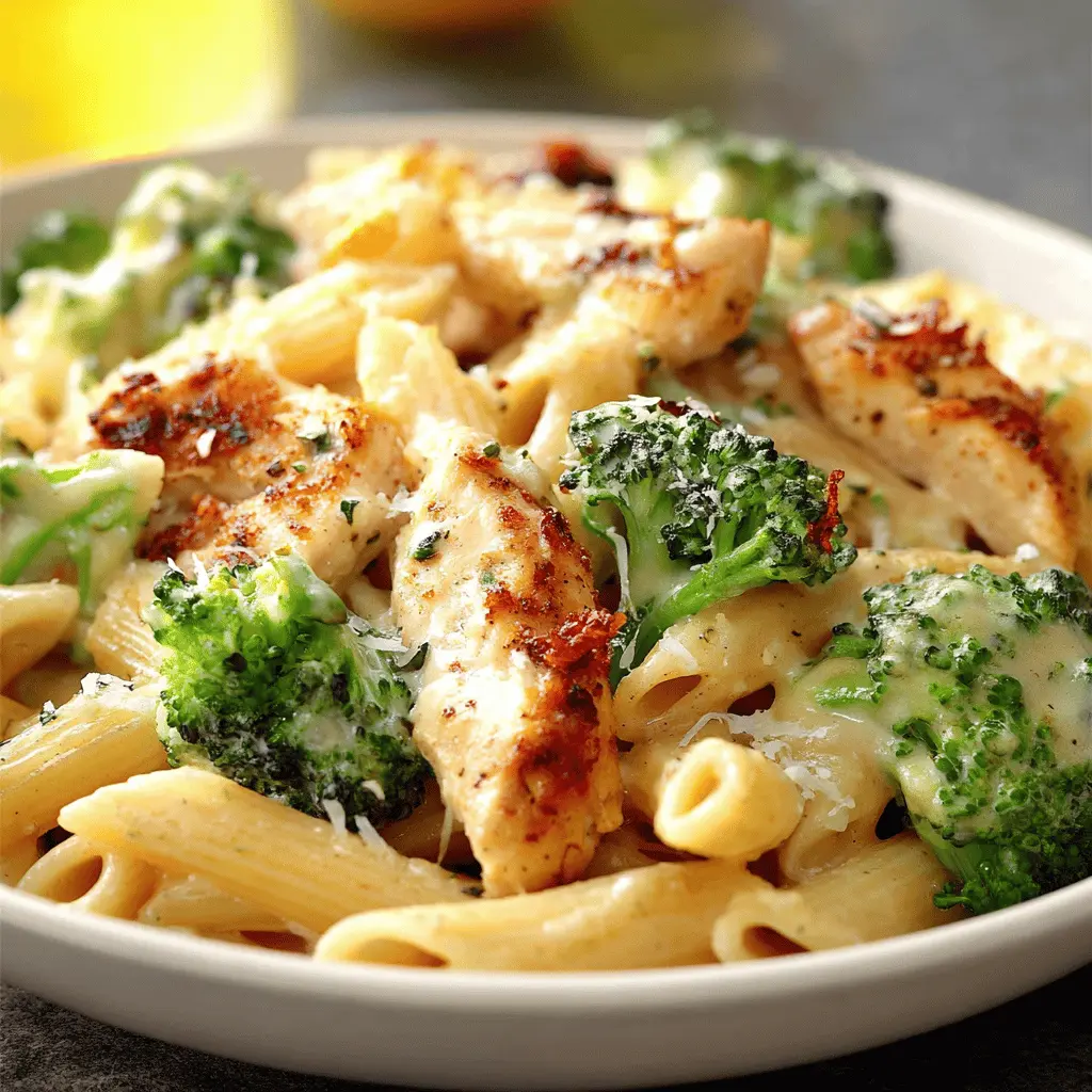 A delicious combination of tender chicken, fresh broccoli, and creamy penne pasta, perfect for family dinners.