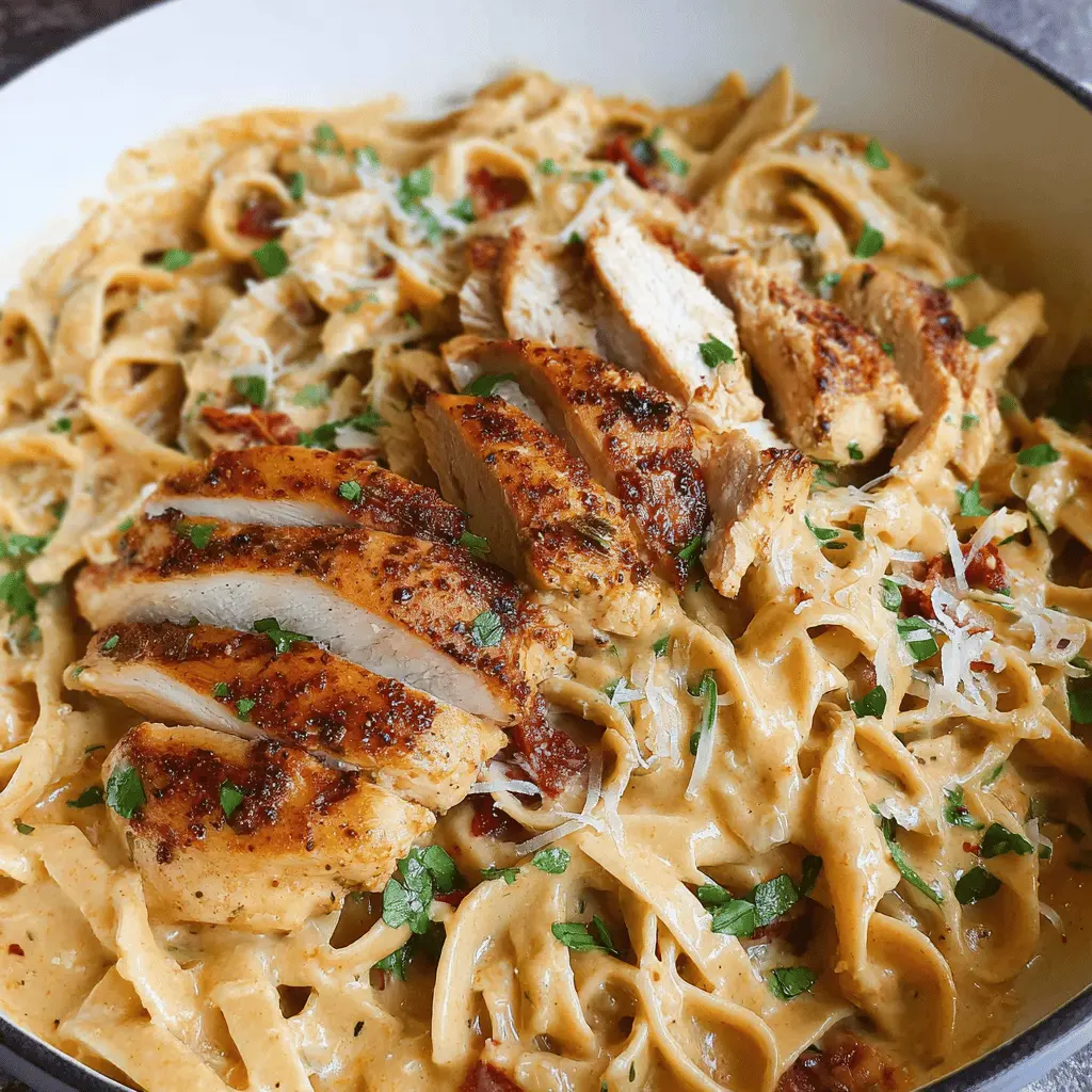 Once your chicken and sauce are ready, it’s time to bring everything together. Add your drained pasta directly into the skillet with the sauce. Stir it gently, using some of that reserved pasta water if needed, to achieve a silky texture that envelops all those delicious ingredients. You can garnish it with freshly chopped parsley or a sprinkle of Parmesan cheese for added flavor.
