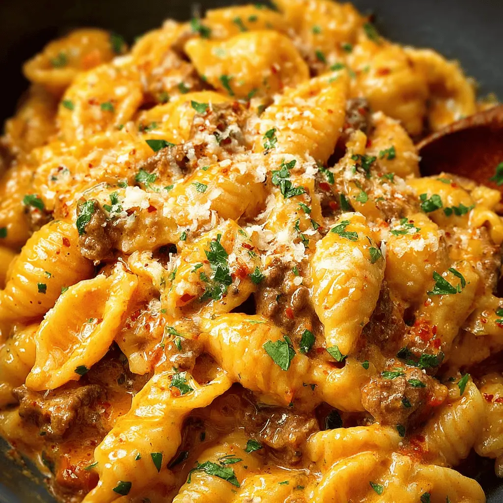 A deliciously creamy and savory pasta dish with tender beef and garlic.