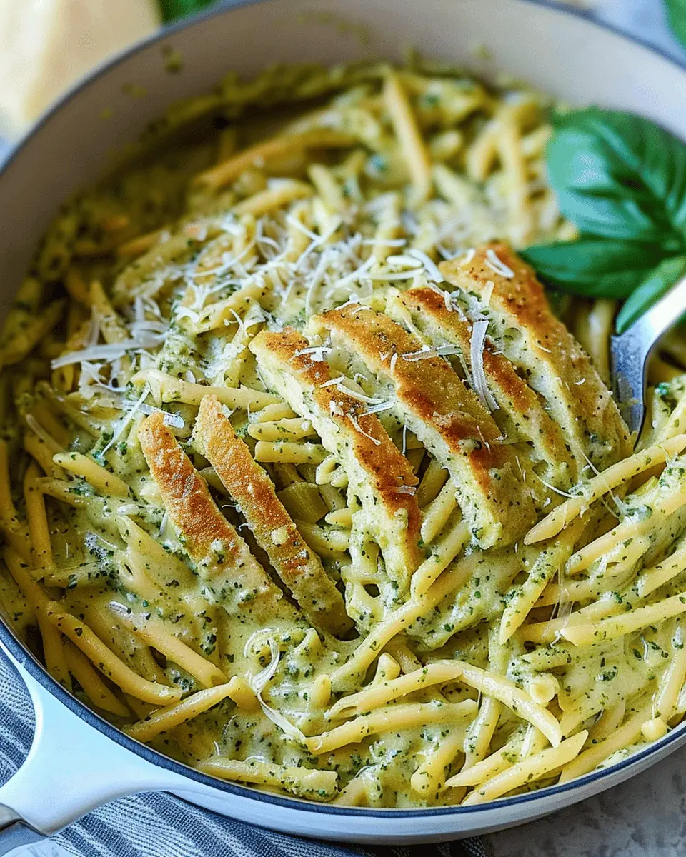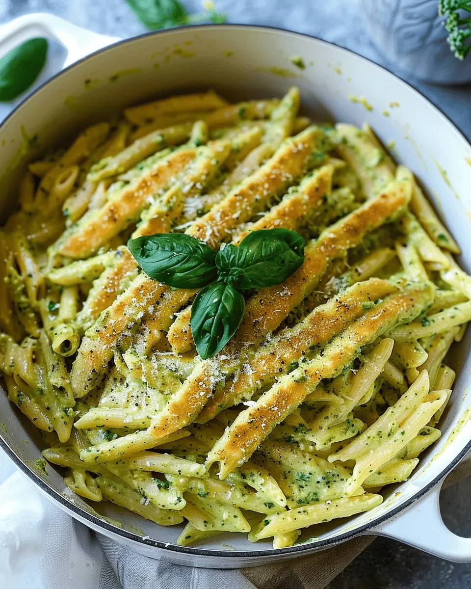 Before serving, consider topping your pasta with extra Parmesan cheese and some fresh basil for that restaurant-quality finish. With each bite, you’ll taste the creaminess of the sauce and the aromatic notes of the pesto—pure bliss!
