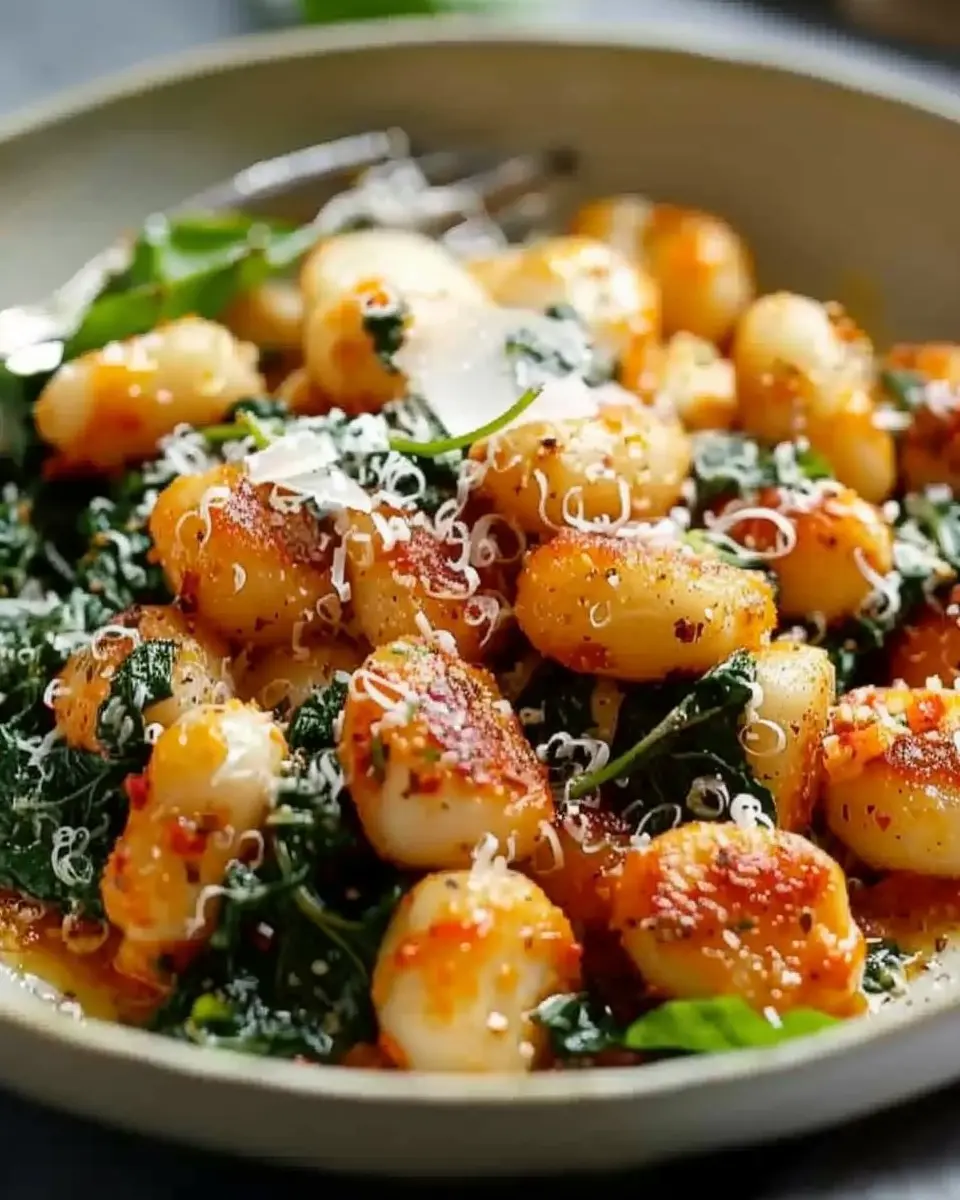 Spinach is a fantastic addition that gives your crispy gnocchi a nutritional boost along with a pop of color. Add a handful of fresh spinach to the skillet right after sautéing the garlic. Cook until it wilts down, which will take just about 2-3 minutes.