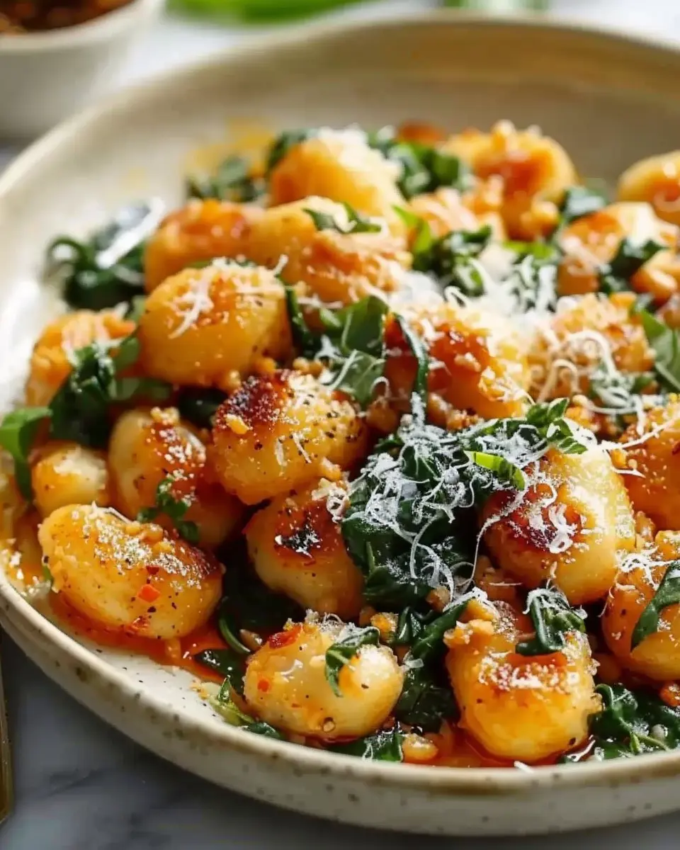 - Transfer the cooked gnocchi to a serving dish. You can garnish with additional spinach or a sprinkle of fresh herbs if desired.
