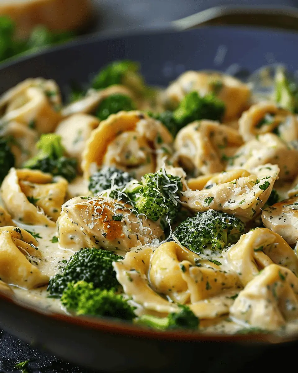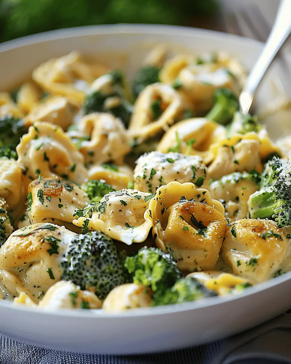 - Combine the cooked tortellini and broccoli with the creamy chicken mixture. Toss gently until well coated.