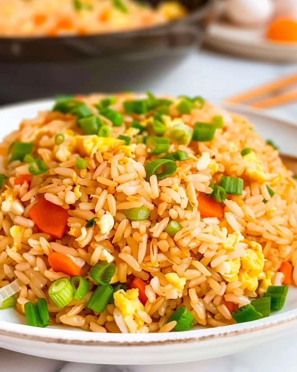 Finally, serve your easy egg fried rice hot, garnished with fresh green onions and maybe a drizzle of sesame oil. You can enjoy this dish on its own or as a perfect side to your favorite Asian-themed main course!