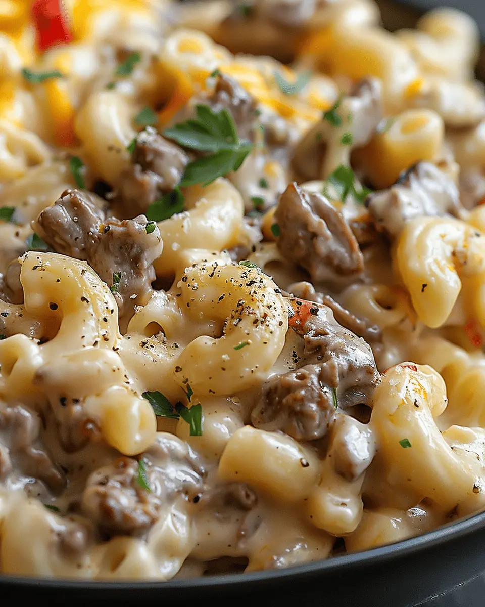High-Protein Creamy Philly Cheesesteak Mac & Cheese Delight