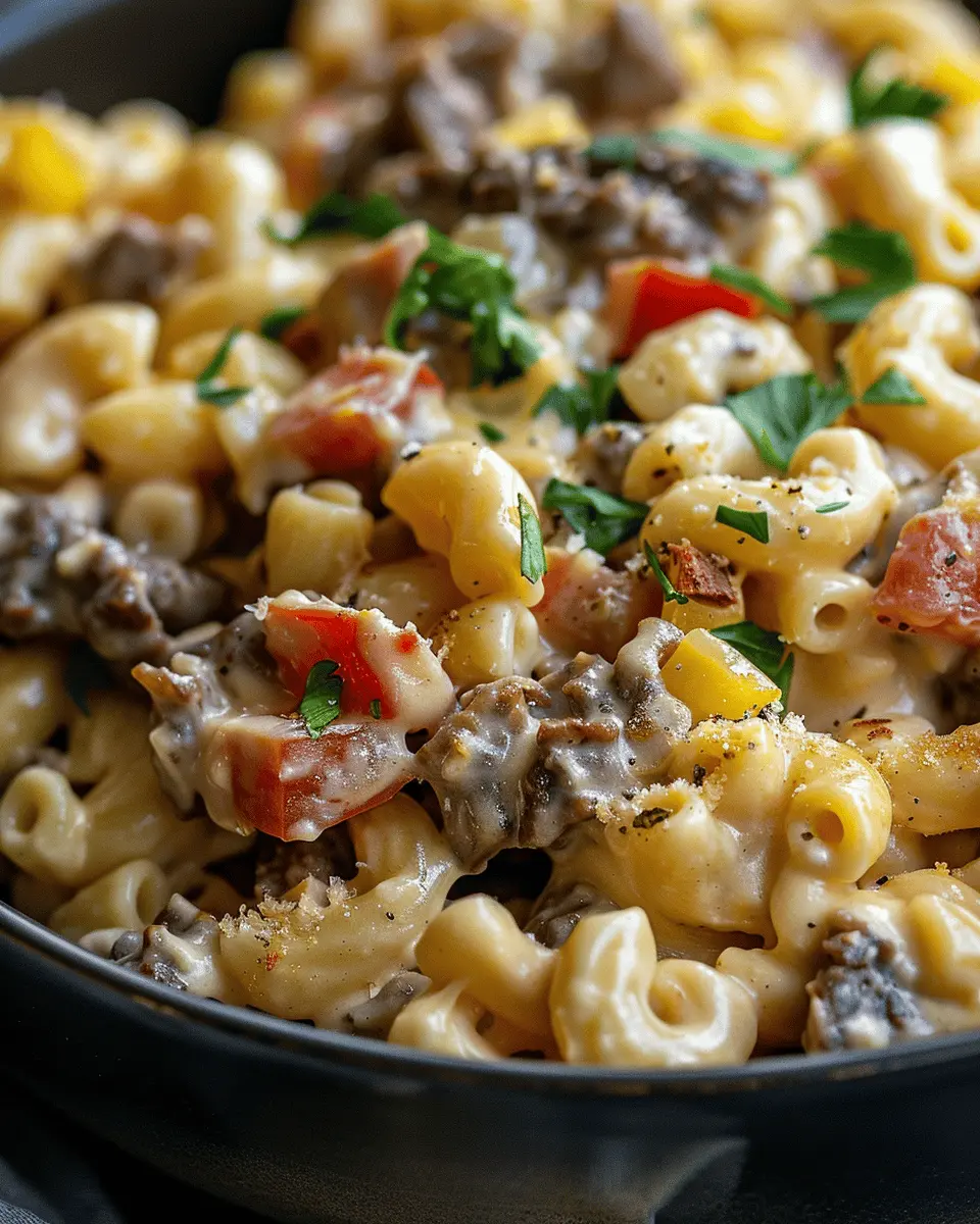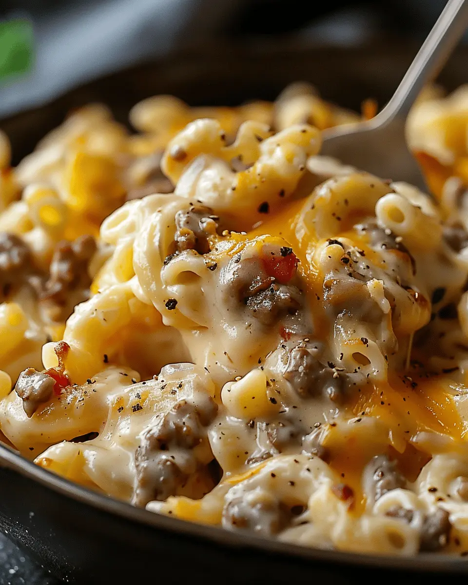 • Mix Together: In a large mixing bowl or directly in the skillet, combine the drained pasta, sautéed beef and veggies, and creamy cheese sauce. Stir everything until well combined.