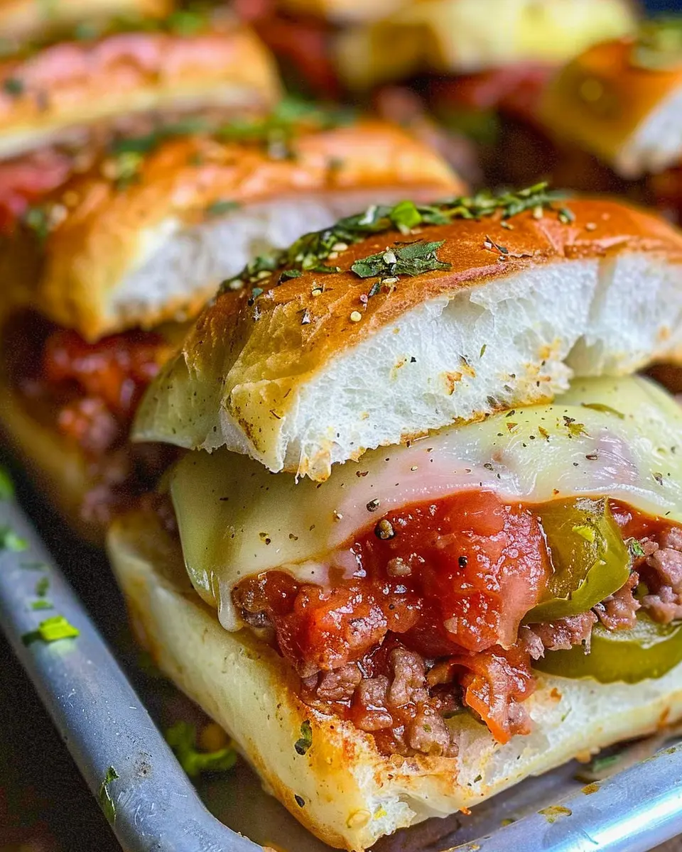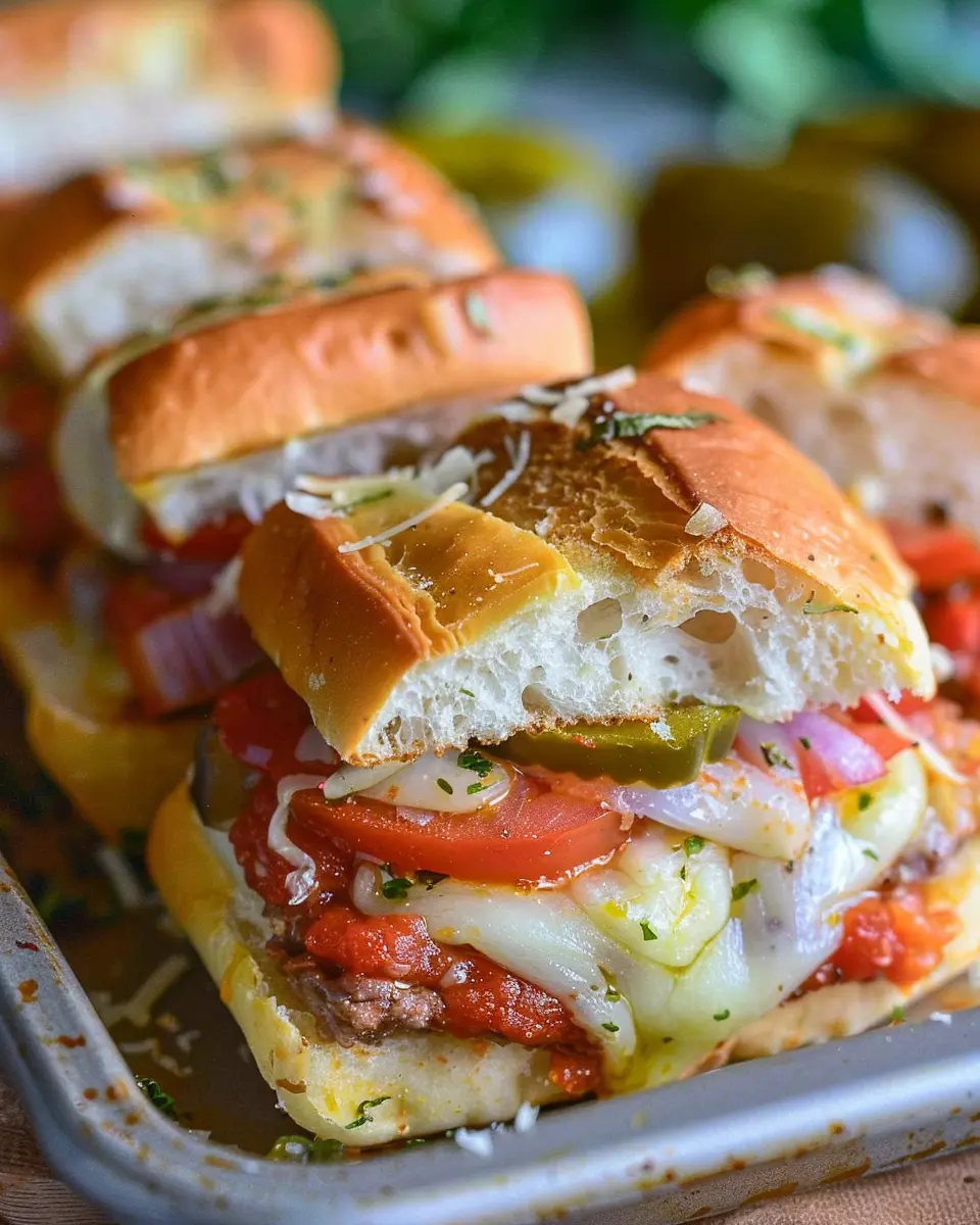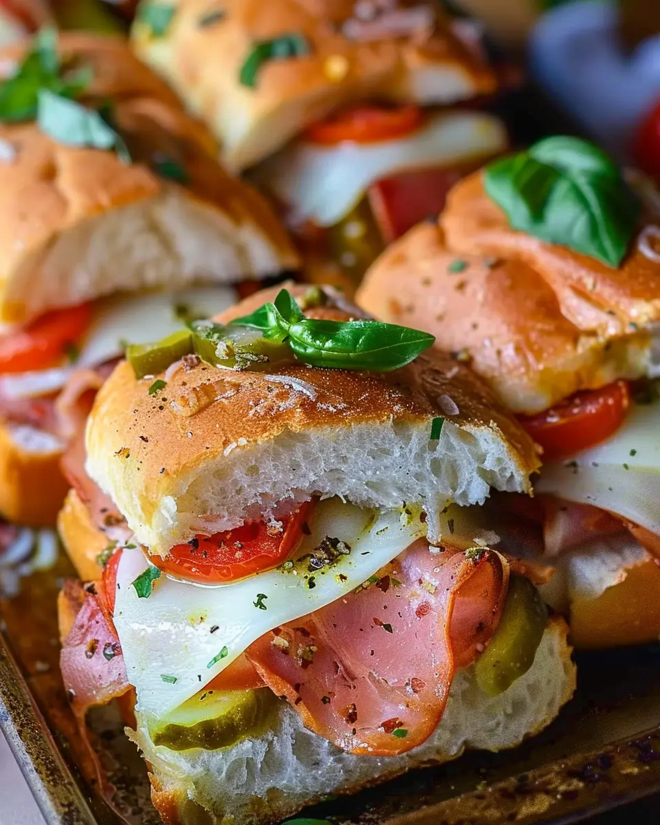 Indulge in these Hot Italian Sub Sliders bursting with flavor from juicy turkey bacon and chicken ham, perfect for your next gathering!