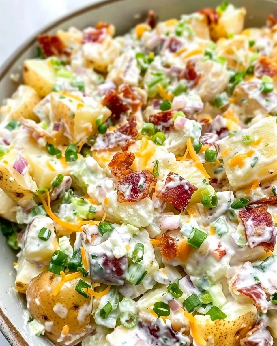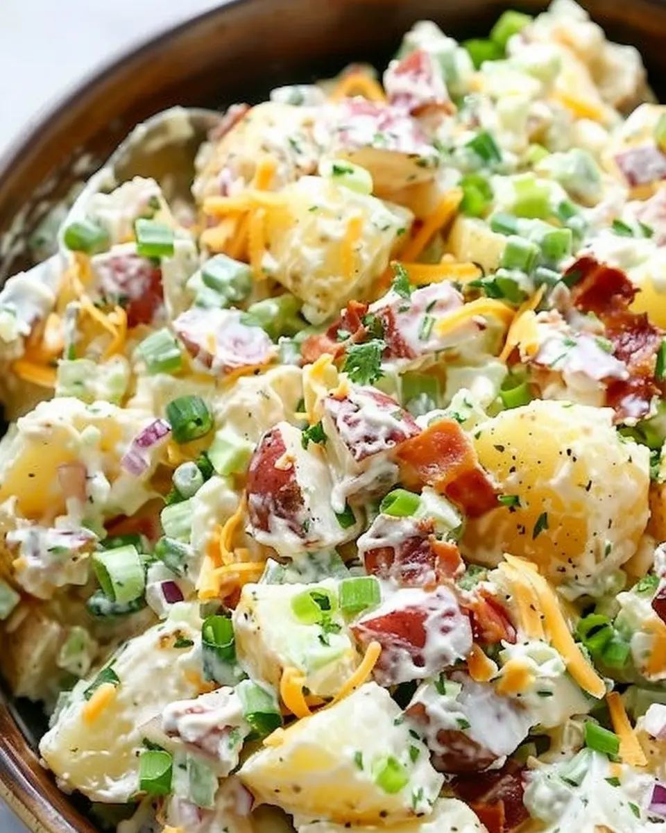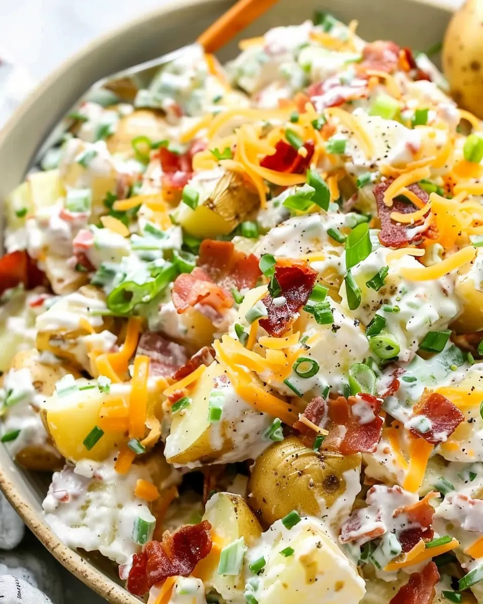 This Loaded Baked Potato Salad is a creamy, delicious twist on the classic, featuring turkey bacon and chicken ham for added flavor.