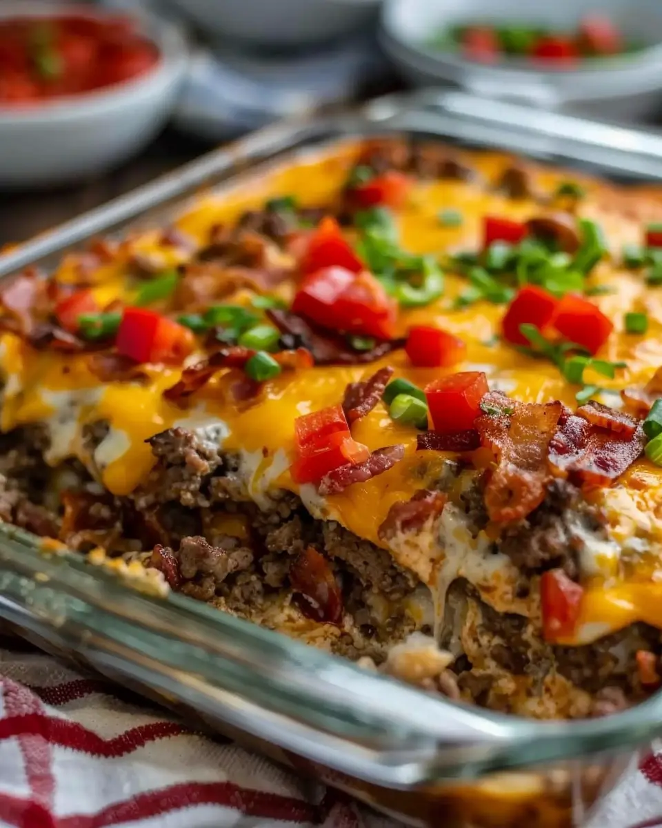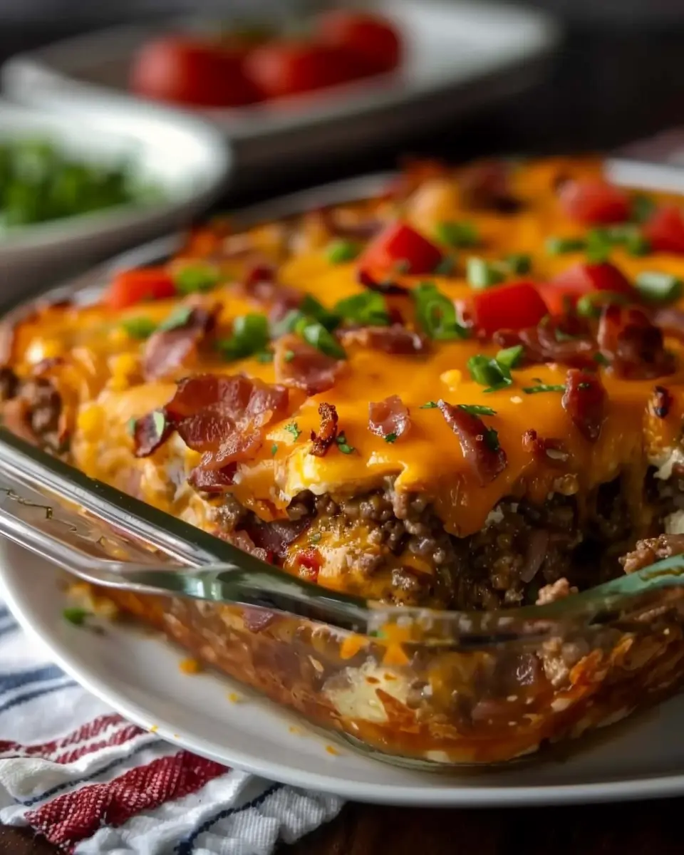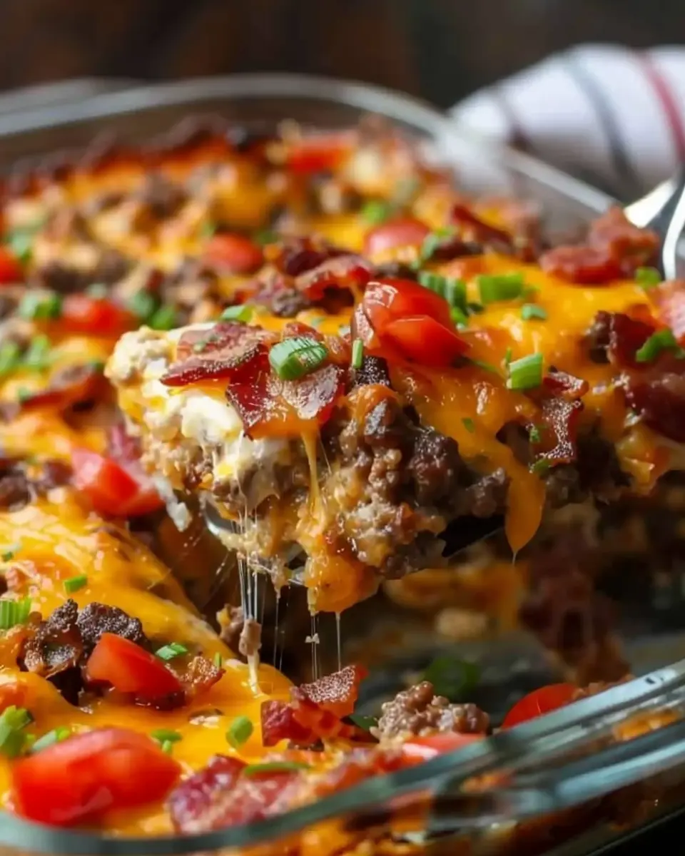 A delicious low-carb casserole packed with all the flavors of a classic bacon cheeseburger.