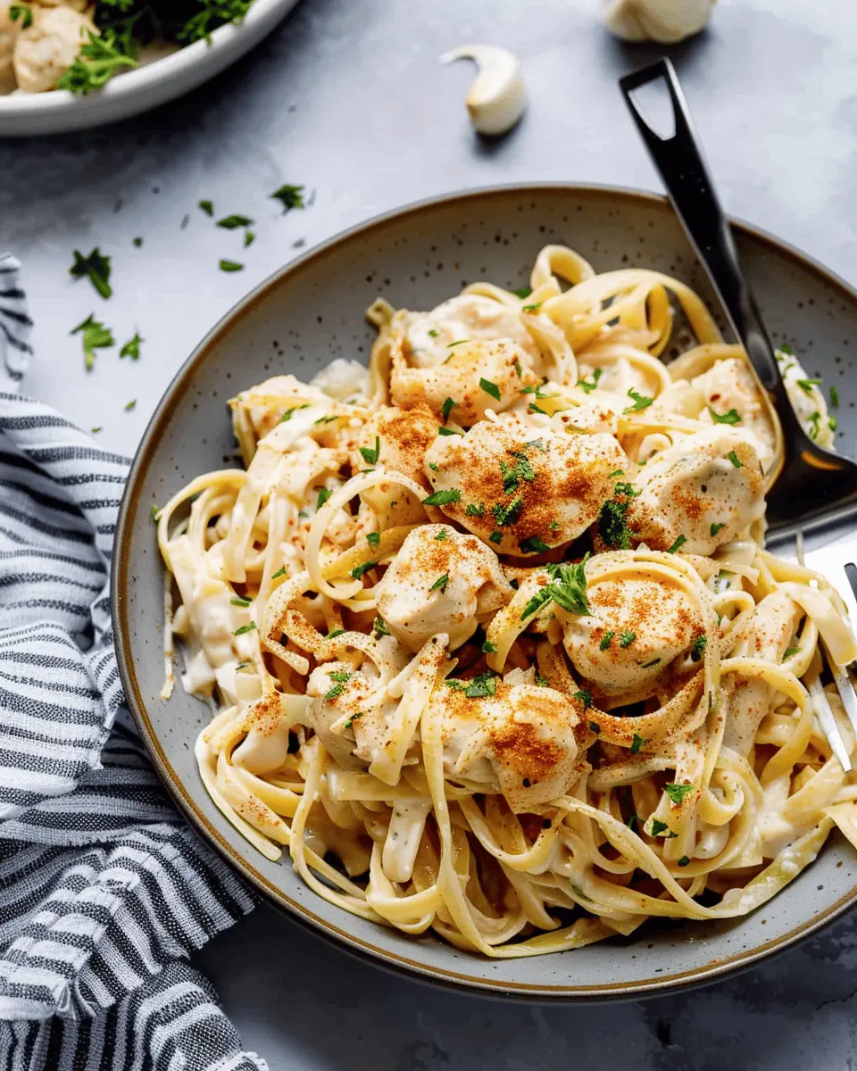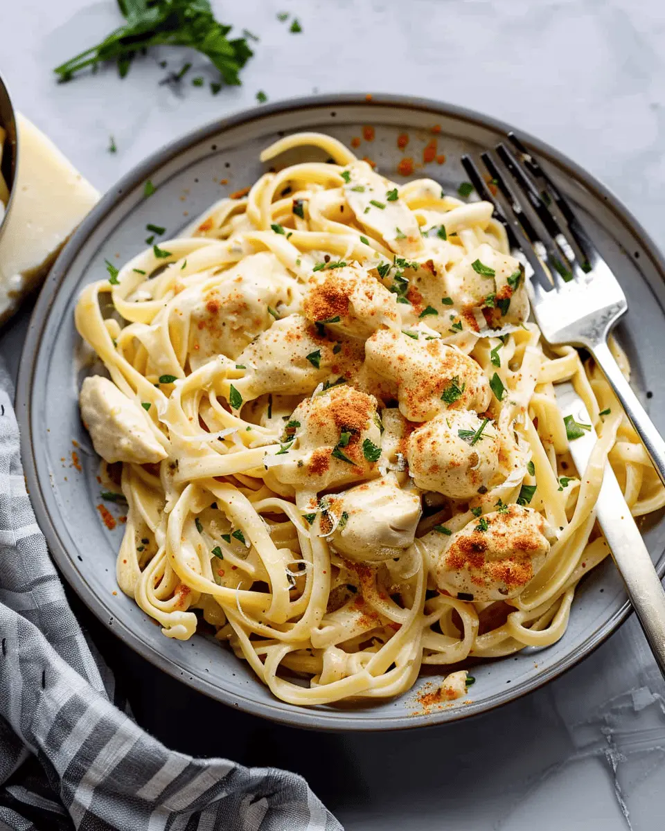 To elevate your dish, chop some fresh green onions and sprinkle them on top just before serving. This adds a nice pop of color and freshness that compliments the creaminess of the Alfredo sauce.
