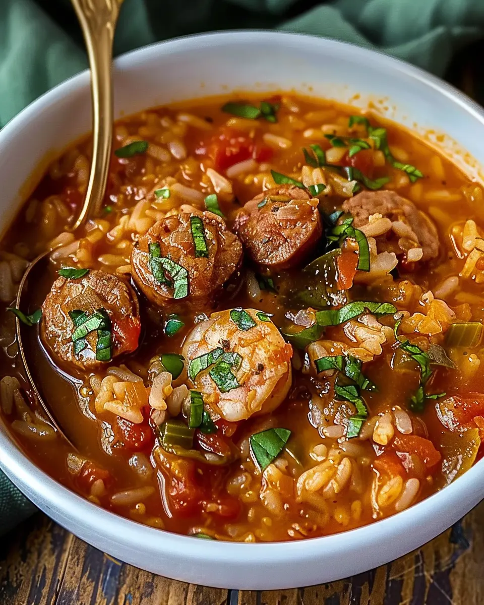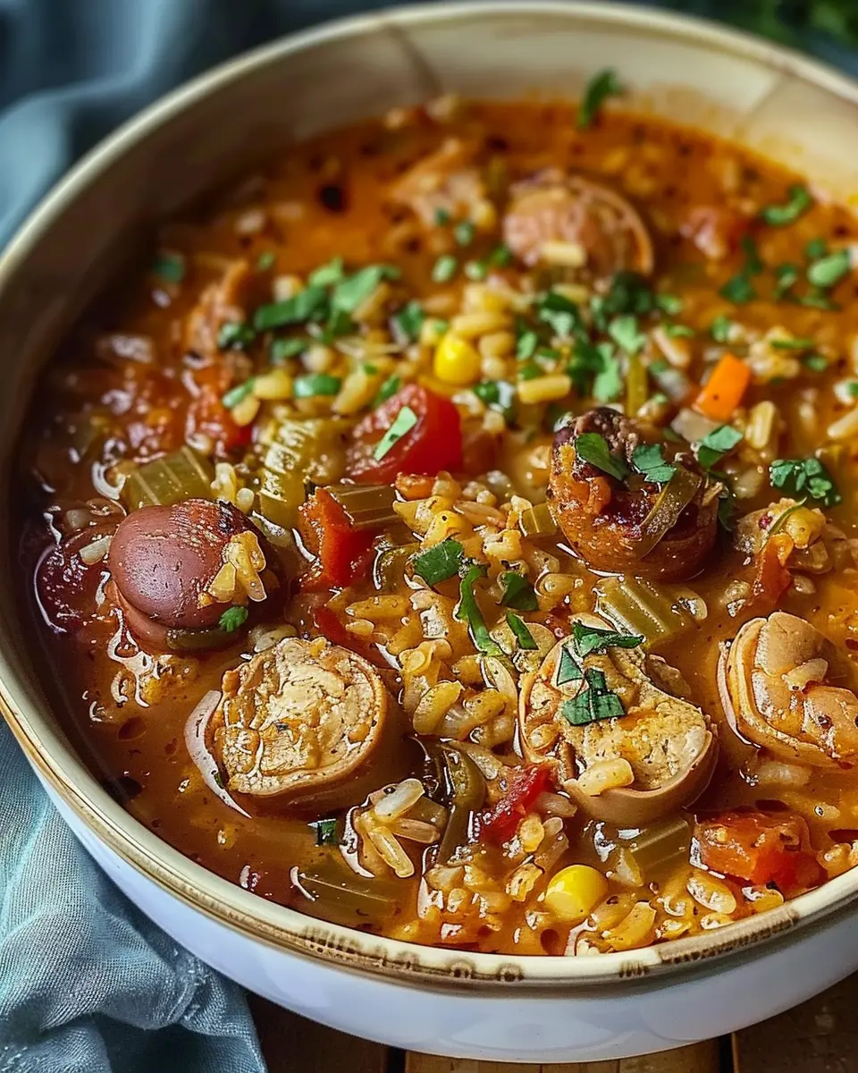 PrintSpicy Jambalaya Soup: A Comforting Twist with Turkey Bacon and Chicken Ham