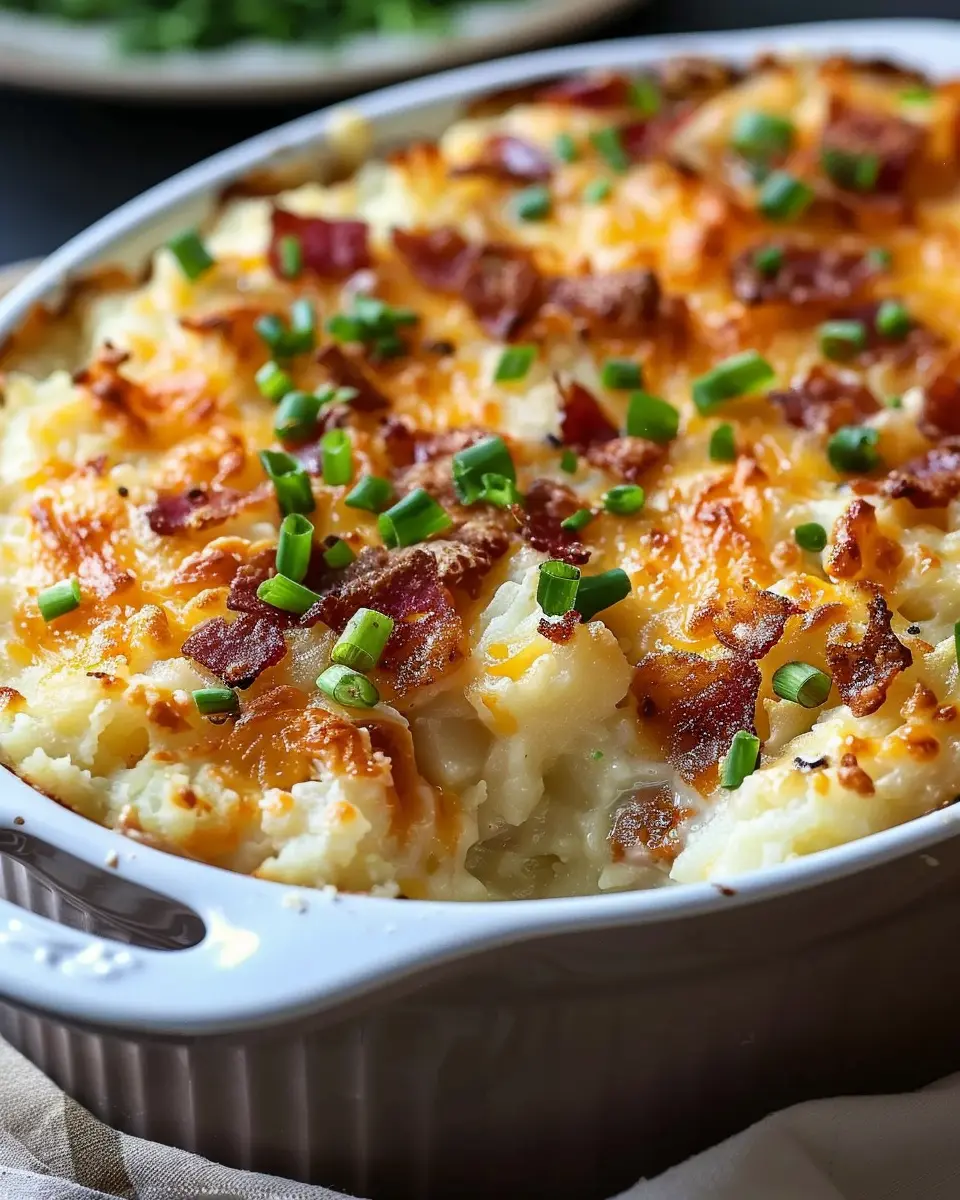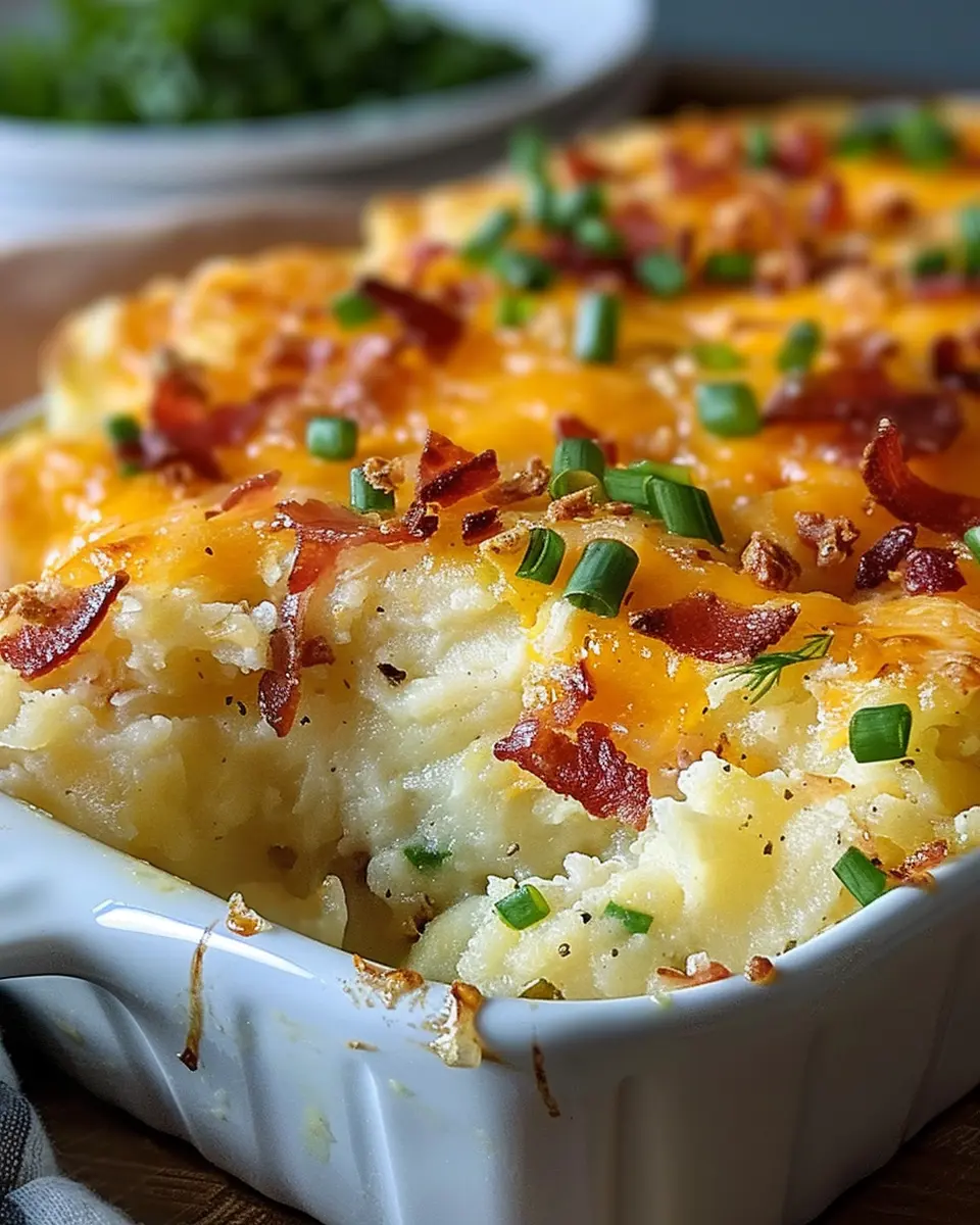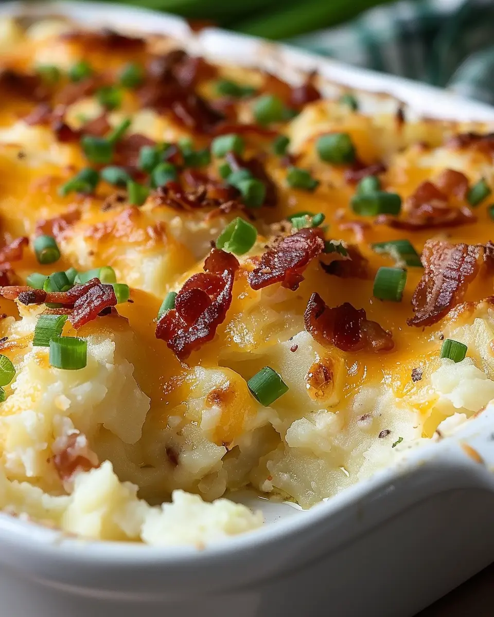 Twice Baked Potato Casserole is a creamy, cheesy dish that brings comfort food to a whole new level with the addition of turkey bacon.